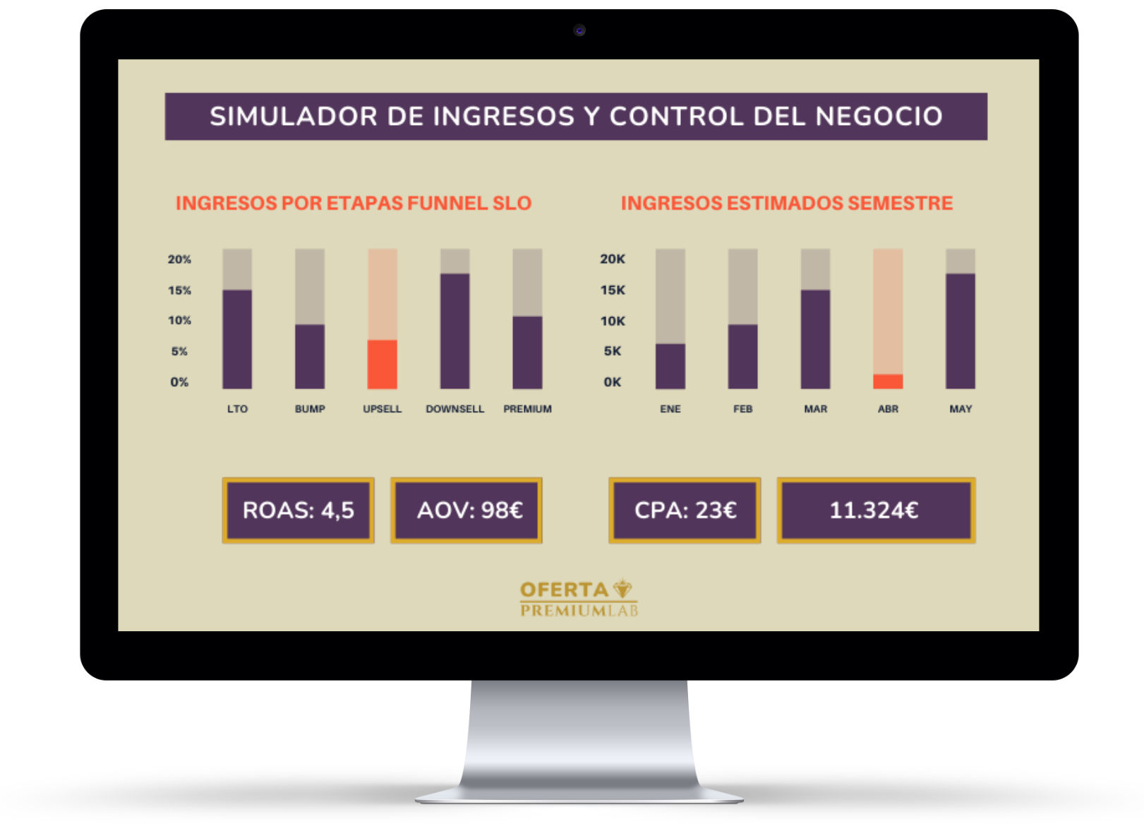 Con esta tabla dinámica, podrás simular cada una de las etapas de tu Funnel Oferta Premium™ para alcanzar el punto de equilibrio de tu negocio online de manera clara y rápida. El único cuadro de mandos que vas a necesitar para evaluar y proyectar tu negocio online hacia el éxito.